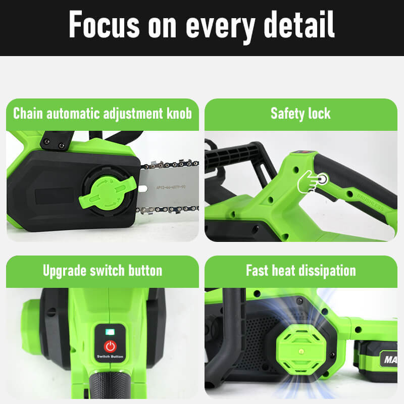 Με το αυτόματο σύστημα λίπανσης αλυσίδας, έχετε συντήρηση χωρίς προβλήματα. Είτε το αποκαλείτε αλυσοπρίονο μπαταρίας 12 ιντσών είτε ηλεκτρονικό αλυσοπρίονο 12 ιντσών, αυτό το εργαλείο είναι κατασκευασμένο για να αποδίδει σε οποιαδήποτε εργασία σε εξωτερικούς χώρους.
